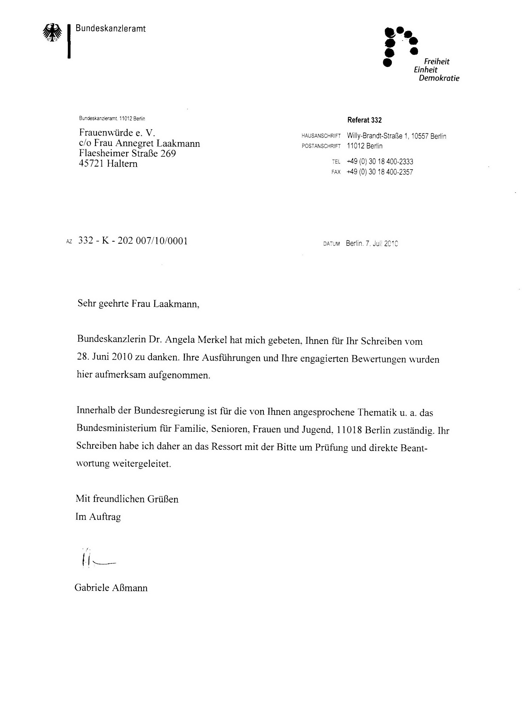 Gegen die geplanten Einsparungen beim Elterngeld und bei den Rentenbeiträgen für HartzIV/ALGII-Empfängerinnen und -Empfänger hat der Frauenwürde e.V. per Brief an die Bundeskanzlerin Angela Merkel protestiert. > Brief an Bundeskanzlerin Angela Merkel