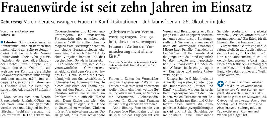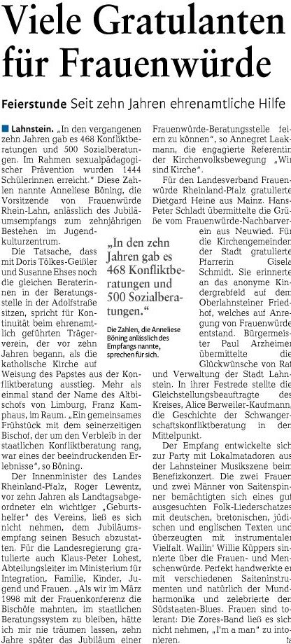 Zehn Jahre Frauenwürde Rhein-Lahn